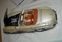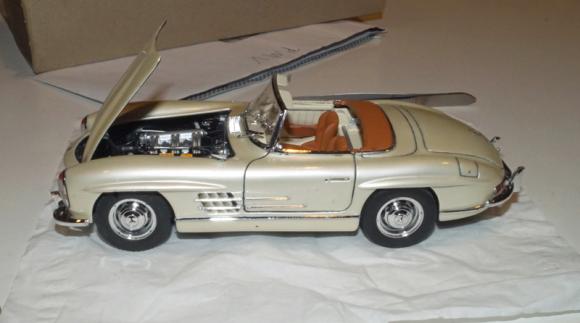 Bei meinem Modell handelt es sich um den Mercedes Benz 300 SL Roadster in 1:24, das Revell 1978 auf den Markt gebracht hat. Die Kunststoffteile waren silbergrau, schwarz, klar und verchromt abgespritzt. Es gibt das baugleiche Modell auch von Italeri in rotem Kunststoff.
