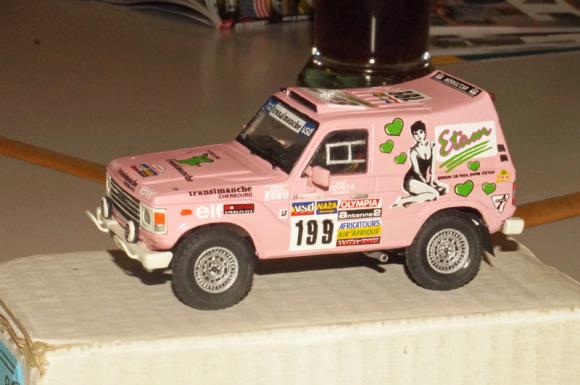 Reiner hatte seinen Toyota Land Cruiser FJ 60 Rallye Paris- Dakar 1986 in 1:43 dabei. Diese Version des Toyota Land Cruiser wurde von 1981 – 1990 gebaut. Die meisten Rallye-Fahrzeuge hatten jedoch eine Kunsstoff/Kevlar-Karosserie, die letztendlich mit der Serienversion wenig gemeinsam hatte. In einem meiner Bildbände über die Rallye Paris-Dakar fand ich ein brauchbares Foto des Vorbildes.. ,die auffällige Farbe und letztendlich der Hauptsponsor (Etam – Damenunterwäsche, wurde 1916 in Deutschland gegründet und ab Anfang der 1930er Jahre in Frankreich bis in die Gegenwart weitergeführt) haben mich zu diesem Modell geführt.