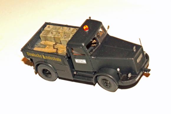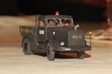 Das Modell stammt von der Firma Weinert, hauptsächlich Weißmetall mit Ätzteilen zur Detaillierung. Da der Bausatz aus einer Sammlungsauflösung stammte, fehlte die Bauanleitung, was Hans aber nicht von seinem Projekt abschreckte. Grundsätzlich hat er Kleinigkeiten verändert. So hat er den Druckluftrechts durch einen Tank ersetzt. Auf dem Dach hat Weinert ein Anhängerdreieck geplant. Hans hatte aber Fotos von K 631, die dort eine Rundum-Leuchte hatten. Dies gefiel ihm besser und er baute eine solche Leuchte an. Die Rückleuchten entstanden aus fotogeätzten Rückspiegeln. Die Weinertsche Fqahrerfigur erhielt Kopf und Extremitäten von Preiser. Die Vorderachse wurde höher gelegt und die Hinterachsführung musste verlegt werden, da sie nicht mittig war. Heraus kam wieder ein Topmodell.