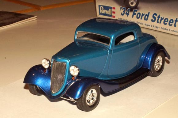 Ein zeitloses (für mich) schönes Modell von Revell. Ich finde das 34er Ford Coupe als Basis für einen Hot Rod am schönsten, schöner als der 32er. Eine harmonische Form! Auch das ZZ Top Auto ist ein 34er Ford. Echte 34er aus Blech sind als Basis rar und teuer geworden. Es gibt auch in Amerika Kunststoffnachbauten in 1:1. Man chopped das Dach,baut ein neues Fahrwerk, einen neuen Innenraum, einen V8 Motor mit guter Power ( 350-400 PS) und eine tolle Lackierung. Es ist ein relativ kleines Auto.