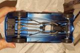 Der Ford istin lila gespritzt und man kann ihn in zwei Versionen bauen. Lilaist nicht so meine Farbe, aber durch die Zweiteilung ist eine Zweifarbenlackierung ein Muß. Es ist in Mittelblau oben und Dunkelblau unten lackiert. Auch wenn es ein Snap Tite ist, sind bis auf den V8 Motor alle Teile dabei. Ein schöner Innenraum, ein Chassis mit Srahlachsen, sehr schöne Chromteile und Flammenaufkleber.